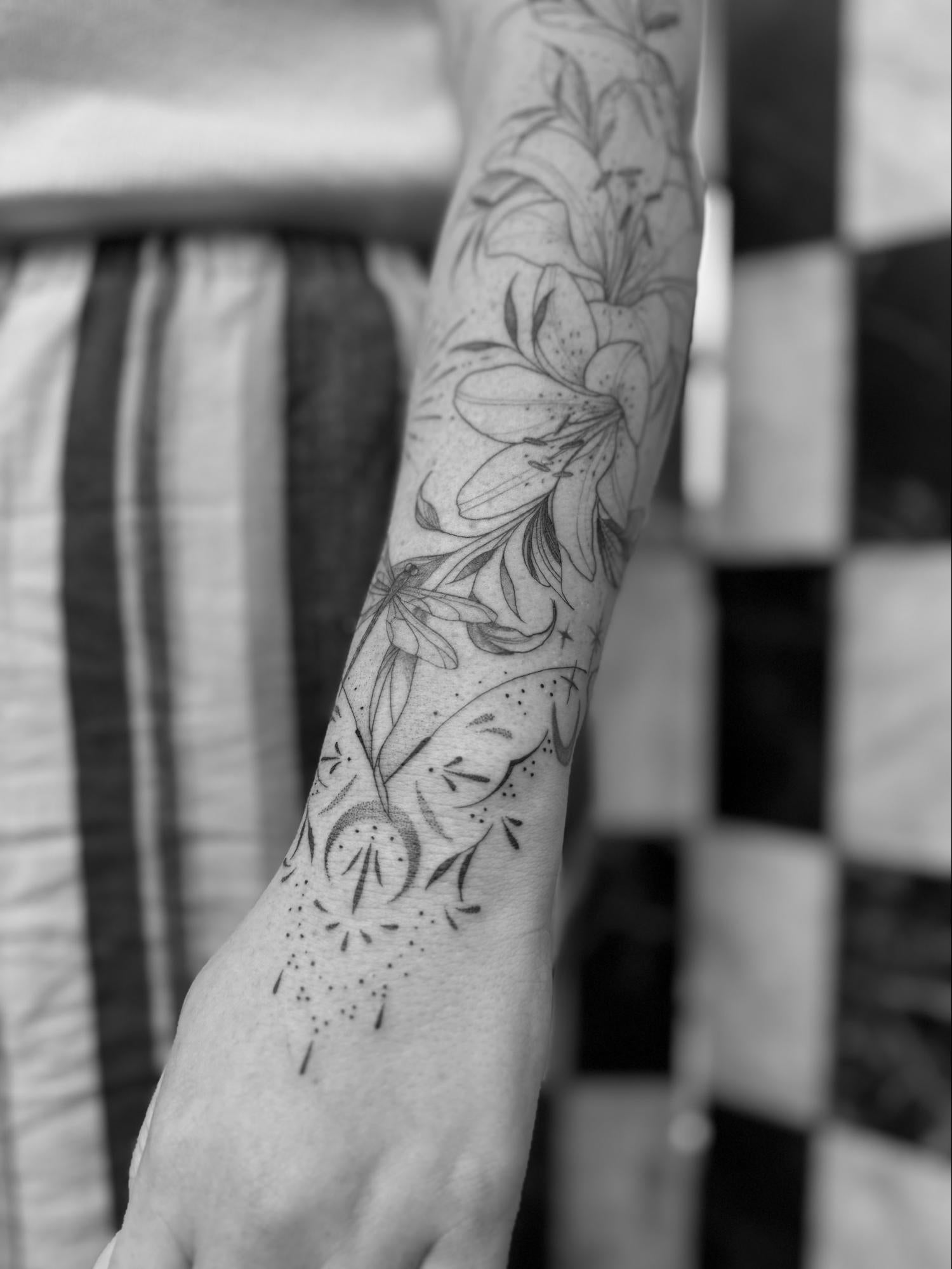 Fine-line, floral, ornamental, dotwork and delicate black & grey tattoos.
